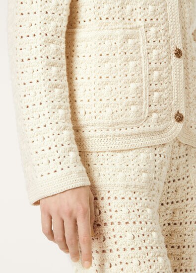 Die leichtgewichtige, feine Jacke Arola ist eine Neuinterpretation der Jacke Spagna aus sommerlicher Perspektive. Gestrickt ist das Modell aus einer einzigartigen Mischung aus üppigem Cashmere und Abacá – einer Bananenblattfaser, die für ihre außergewöhnliche Strapazierfähigkeit bekannt ist. Der Stoff fühlt sich besonders angenehm, nahezu samtgleich, auf der Haut an und unterstreicht das zart gearbeitete Karomuster. Handgehäkelte Borten und Bubble-Knöpfe runden das Gesamtbild ästhetisch ab.